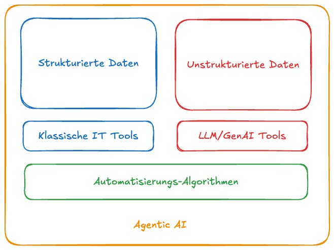 Wenn man diese LLMs mit klassischen IT-Tools, die mit strukturierten Daten arbeiten, kombiniert, entsteht eine neue Gattung an IT-Systemen, für die die Marketingleute das neue Buzzword "AgenticAI" kreiert haben. Durch diese Verbindung von klassischen IT-Systemen, die für strukturierte Daten optimiert sind (wie ERP, CRM oder Datenbanken), mit Large Language Models (LLMs), die unstrukturierte Daten wie Texte, E-Mails oder Dokumente interpretieren können, entsteht ein völlig neues Level an Automatisierungsmöglichkeiten. Diese Integration ermöglicht es, Daten aus unterschiedlichsten Quellen zu kombinieren, Zusammenhänge zu erkennen und automatisiert Maßnahmen einzuleiten – etwa indem ein AgenticAI-System eine Rechnung analysiert, die relevanten Daten mit einem LLM extrahiert, mit Bestellungen aus dem ERP abgleicht und bei Bedarf automatisch eine Rückfrage per Email oder eine Korrektur einleitet.