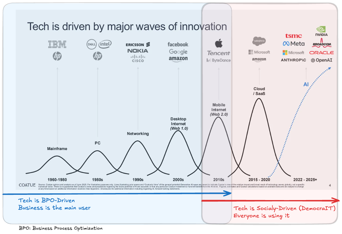 The post-2010 era, however, triggered a "democratization of IT." This shift was fueled by the global adoption of smartphones, now numbering nearly 7 billion worldwide. This explosion of personal computing power gave rise to innovations that were never intended for a corporate setting. Social media, for example, wasn't developed to reduce overhead but to enable and digitize social interactions. This trend was further accelerated by the COVID pandemic, as technology became a critical tool for maintaining social connections.