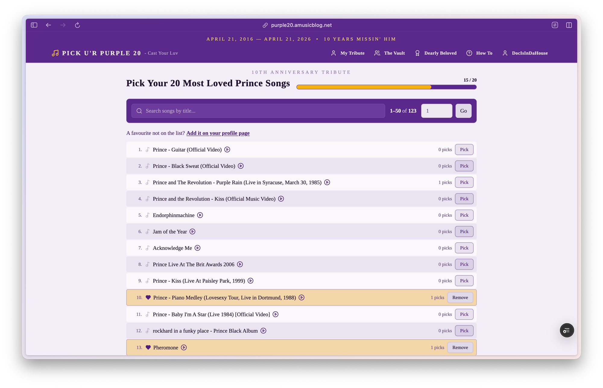 To mark the anniversary, I built a little fan project: an app to pick your 20 most loved Prince songs, build your personal tribute playlist, and share it.